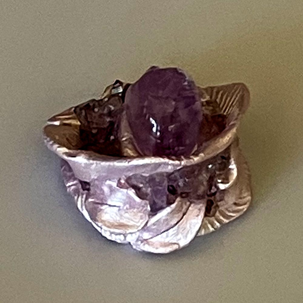 The gemstones include pink and mauve spinel, tumbled amethyst, Vera Cruz amethyst points and a natural pearl.