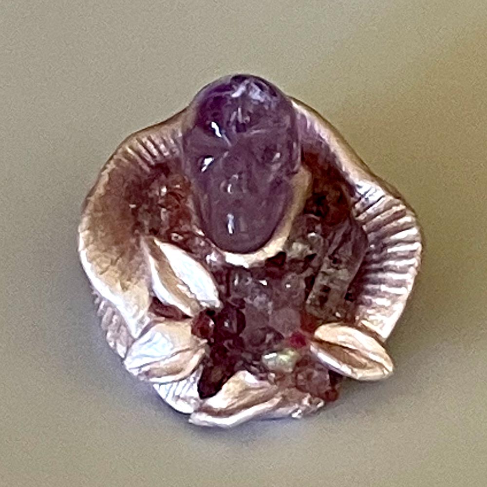 A beautiful petite amethyst skull sits within a gemstone and amethyst point garden. The skull can be easily lifted out, or just enjoy this miniature gemstone garden inspired by Nature and Her Spirits on a tabletop near you.