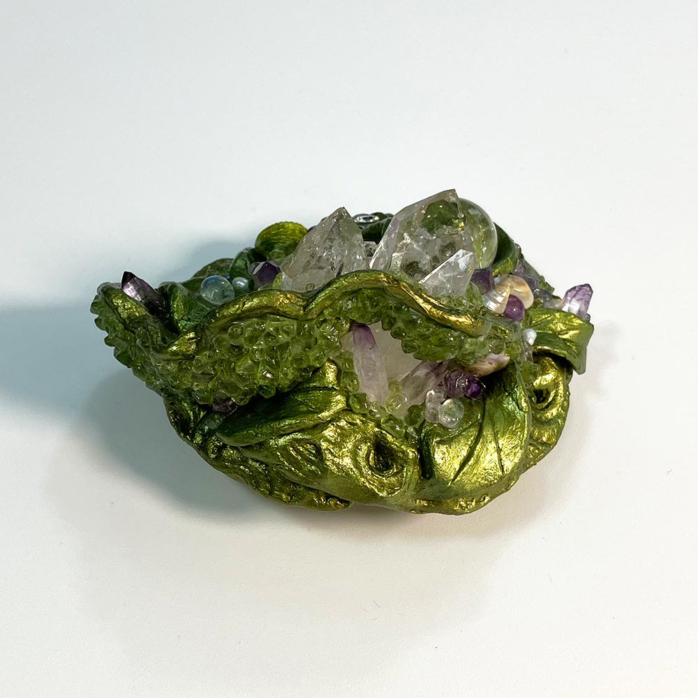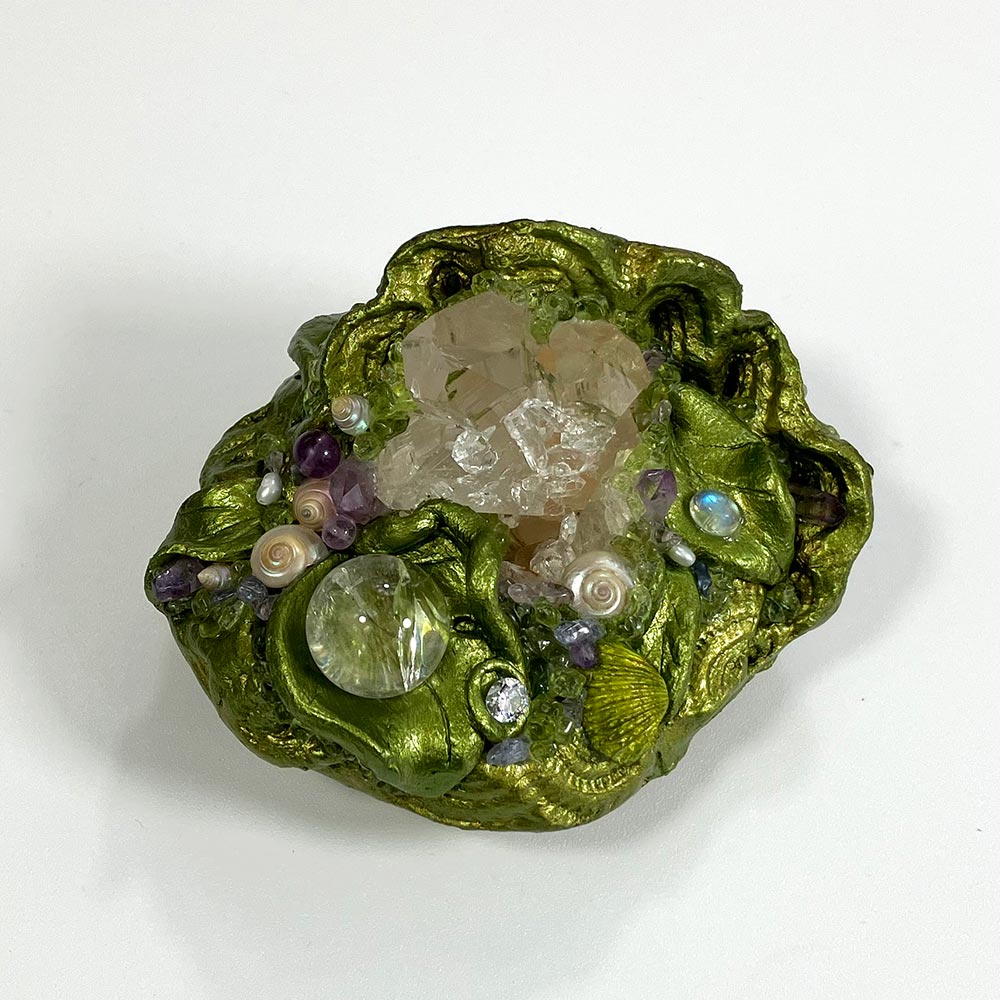 A quartz crystal cluster shares the center focus of this jeweled garden with a very beautiful quartz with flashing of rainbow light, 17mm sphere. The sphere can be easily lifted out, or just enjoy this miniature garden inspired by Nature and Her Spirits. The base of the sculpture is made in clay and painted in my own mixture of professional paint and sealer. The bottom is lined in leather. Adorning the magical garden are: natural amethyst crystal points, tiny tumbled gemstones of peridot, tanzanite, Ethiopian opal, fluorite, shells and freshwater pearls. Each sculpture is one of a kind.