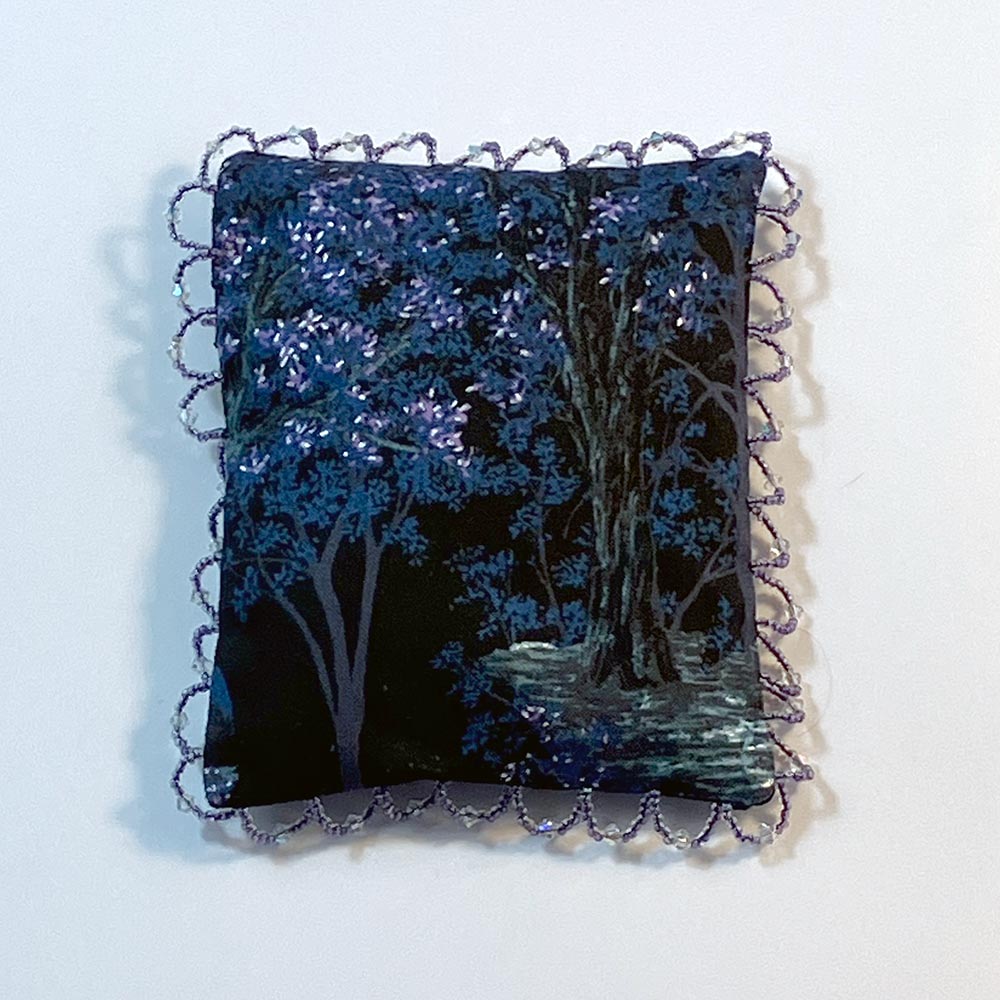 Fragrant and beautiful dream pillow adorned with moonlit trees design and filled with tumbled quartz, tourmaline, and a blend of dream-enhancing herbs. Glass beads adorn the edges.