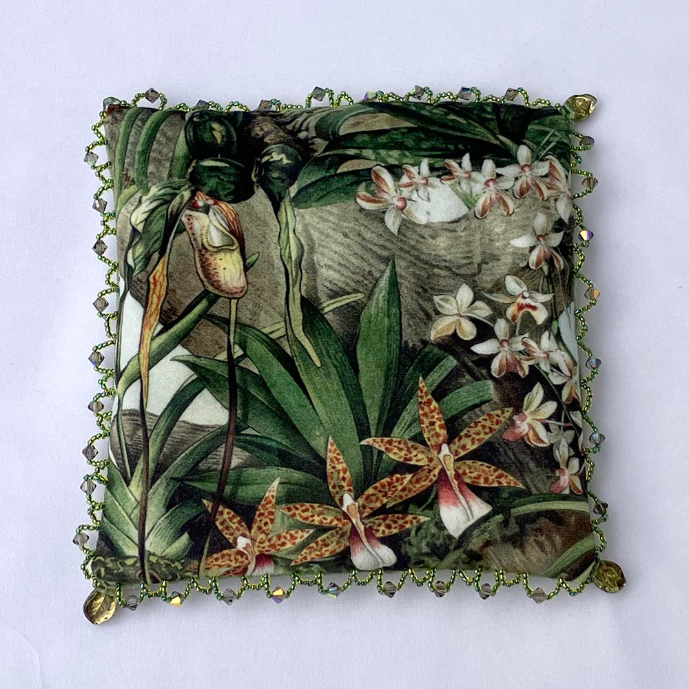 7″ × 7″ pillow in rich Italian velvet with exquisite wild woodland orchid pattern, mossy green crushed velvet back, beaded edging, and glass leaf corner accents. Filled with buckwheat hulls.