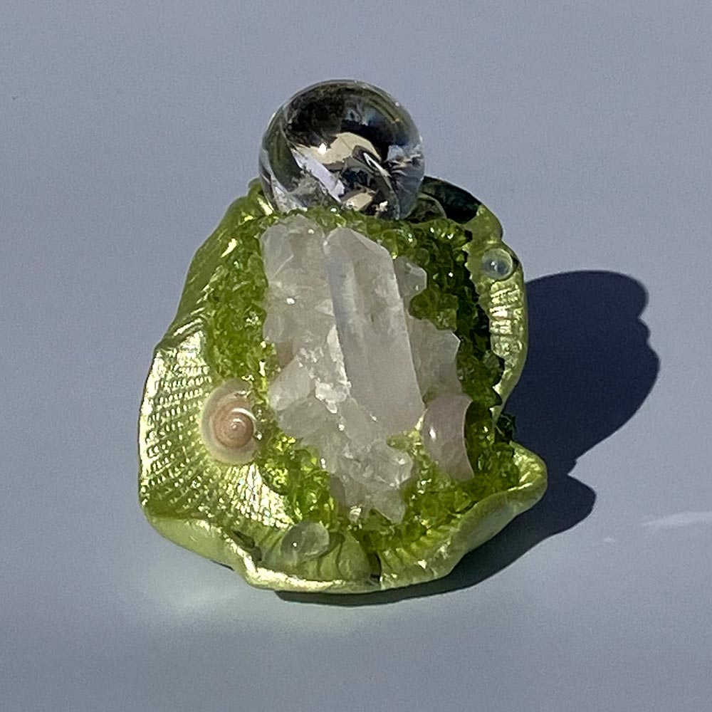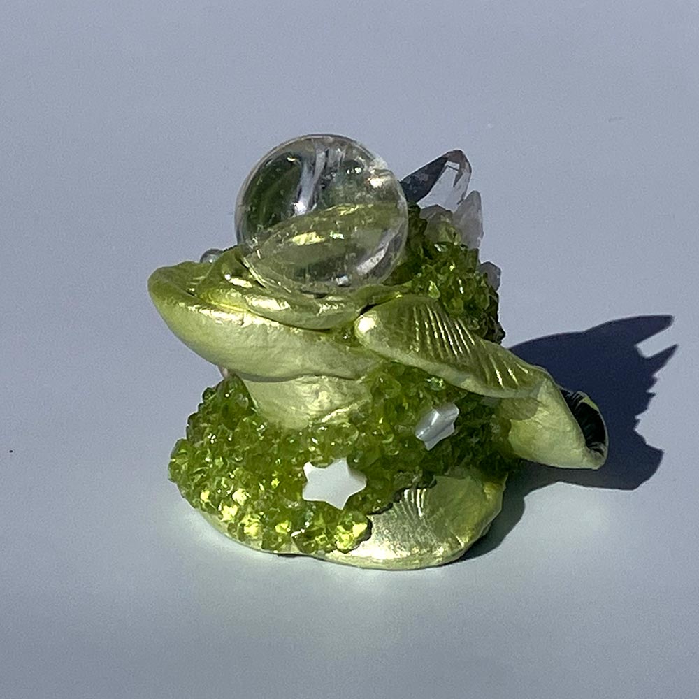 A quartz sphere full of rainbows sits atop a peridot garden. These are natural spring green peridot adorned by a quartz cluster, blue flash moonstones set here and there as dewdrops on an early morning, a kunzite crescent moon, mother of pearl stars, a tumbled blue topaz and the iridescence of snails.